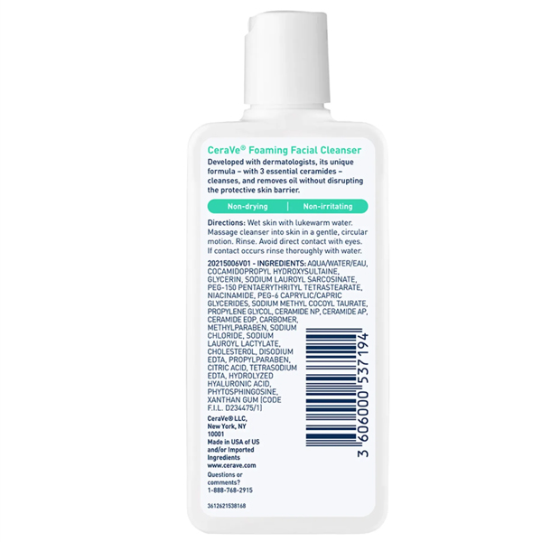CeraVe Foaming Facial Cleanser was developed with dermatologists to deeply cleanse, remove excess oil and refresh the skin without over-stripping it or leaving it feeling tight and dry. Featuring three essential ceramides, hyaluronic acid and niacinamide, this gel-based foaming cleanser is an effective yet non-irritating way to cleanse and care for your normal to oily skin.