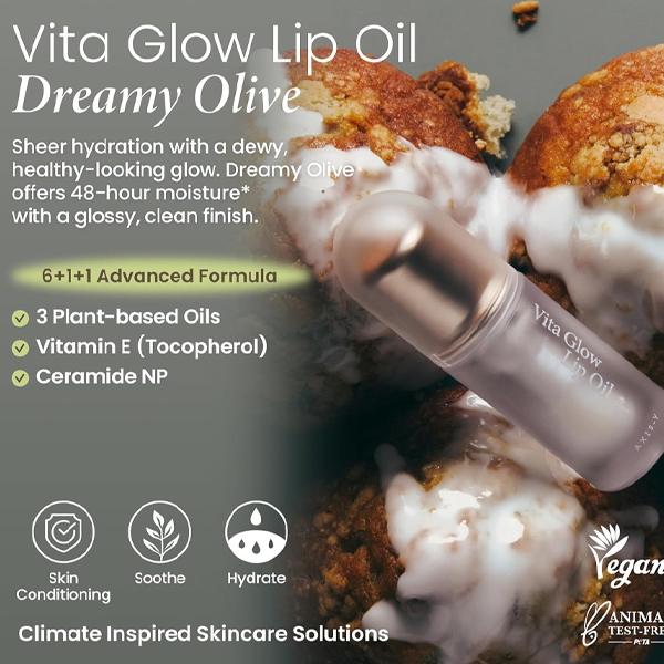 The AXIS-Y Vita Glow Lip Oil (Dreamy Olive) is a vegan, transparent lip oil designed to provide hydration and a glossy, non-sticky finish. It is formulated for dry, sensitive, and flaky lips, with ingredients that strengthen the lip’s moisture barrier.